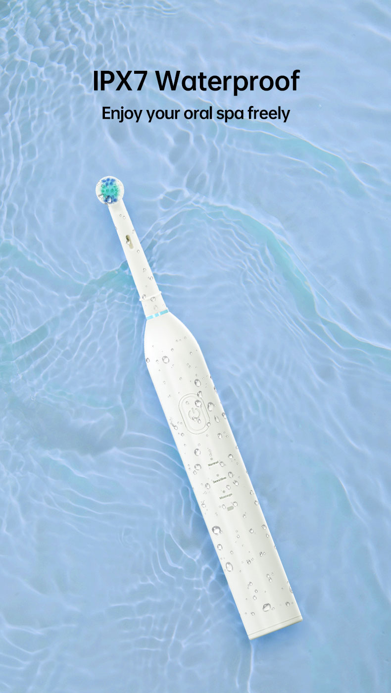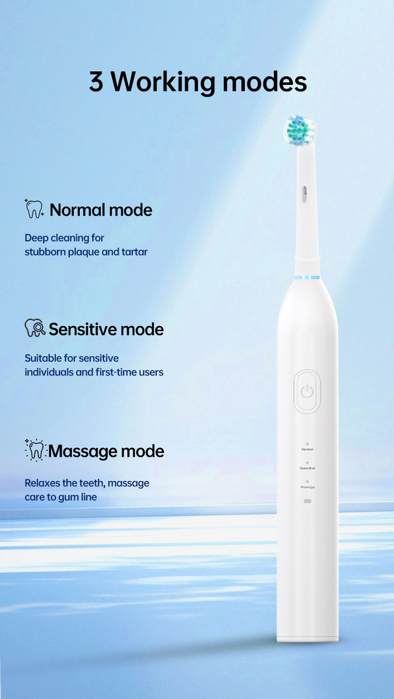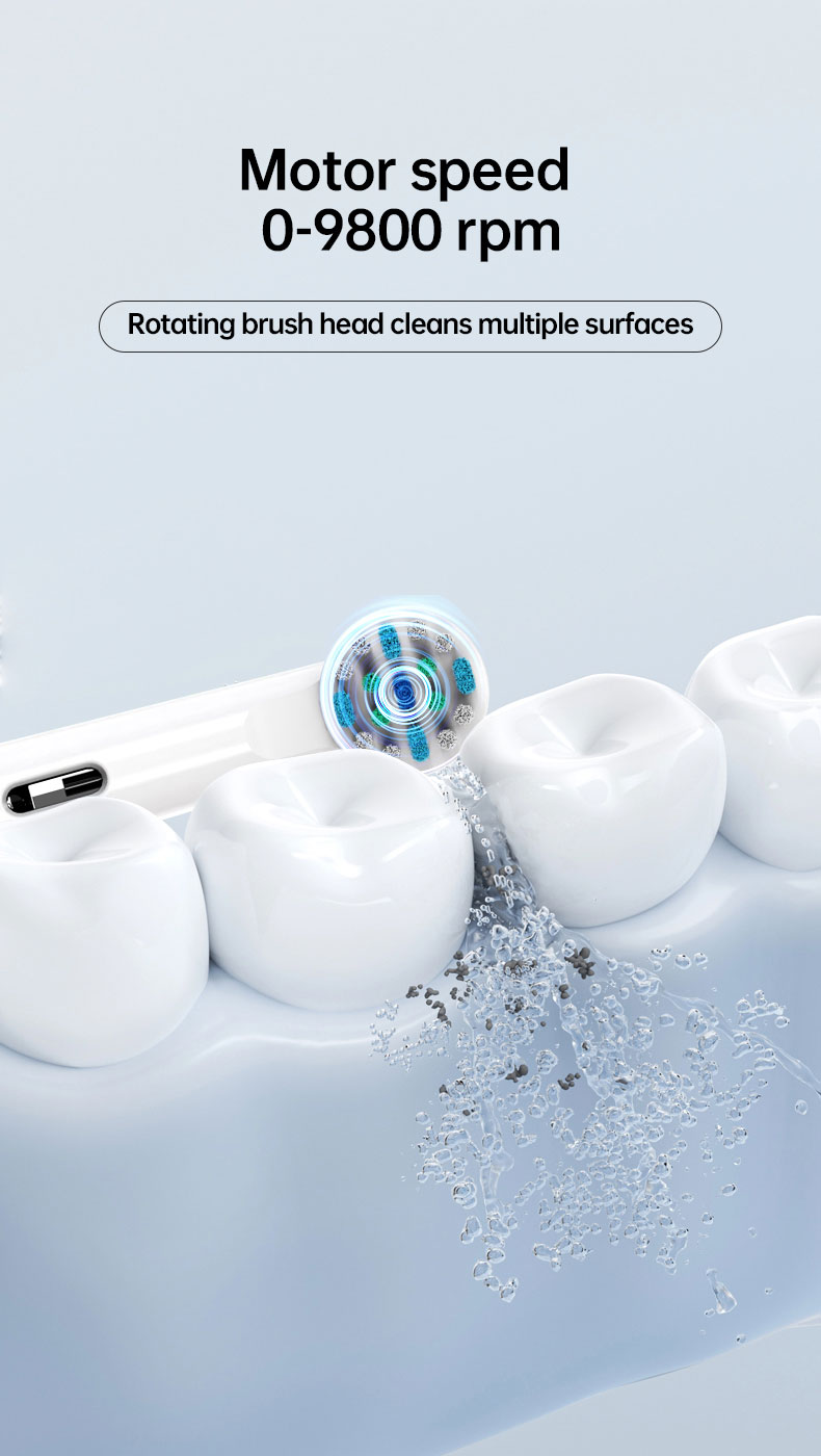 【3 режими для різноманітних потреб у догляді за ротовою порожниною】3 високопродуктивні режими розроблені, щоб задовольнити всі ваші потреби в догляді за ротовою порожниною та допомогти підтримувати здоров’я ротової порожнини. Відбілювання, очищення, чутлива, масаж. Режим відбілювання 100% видалення плям із зубів і зміщення зубного каменю на зубах. Режим Clean проникає глибоко в міжзубний проміжок, очищає бруд, прихований у пародонті. У той час як режим масажу пропонує ніжний масаж ясен