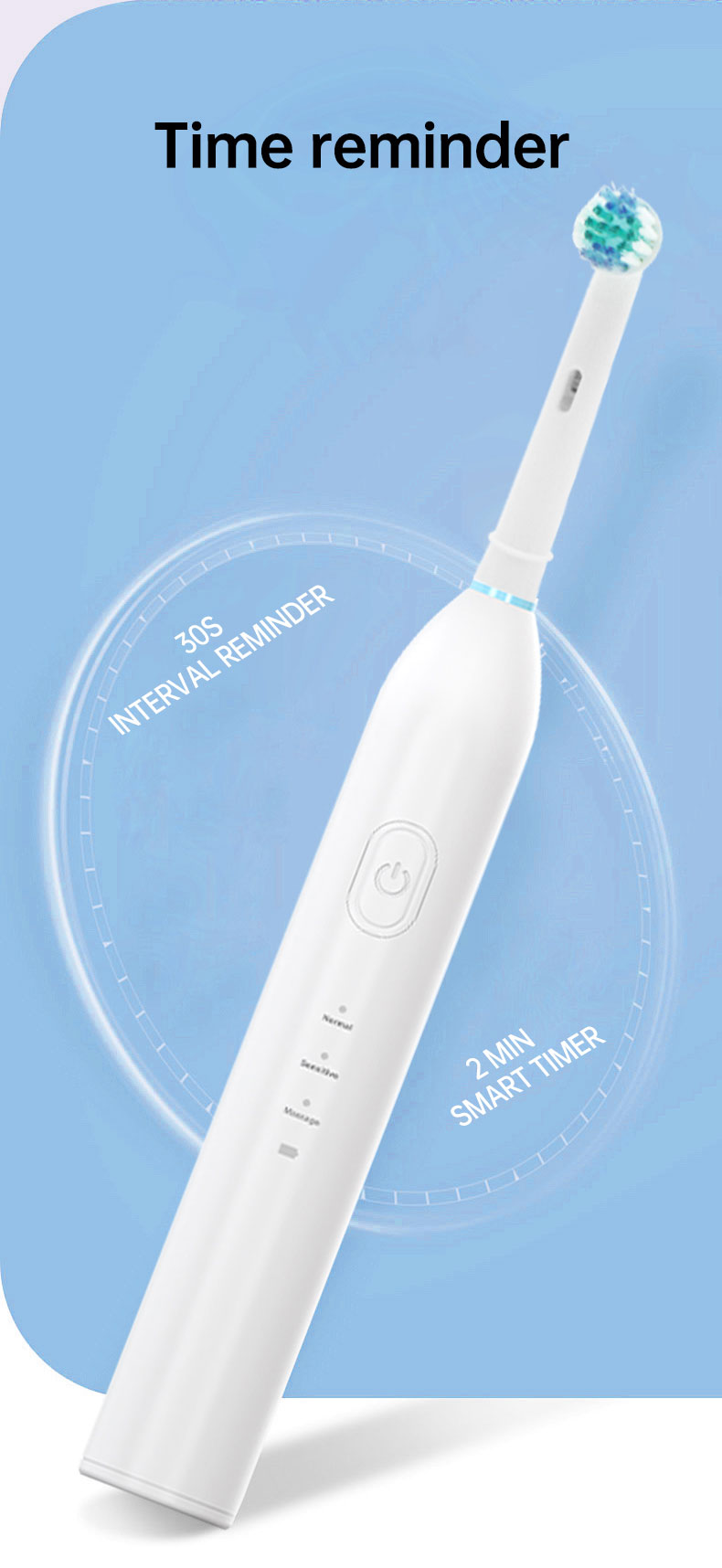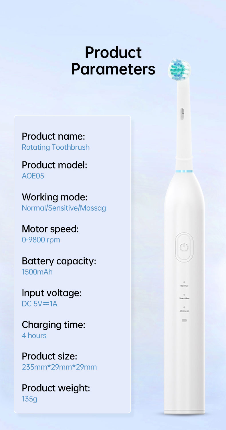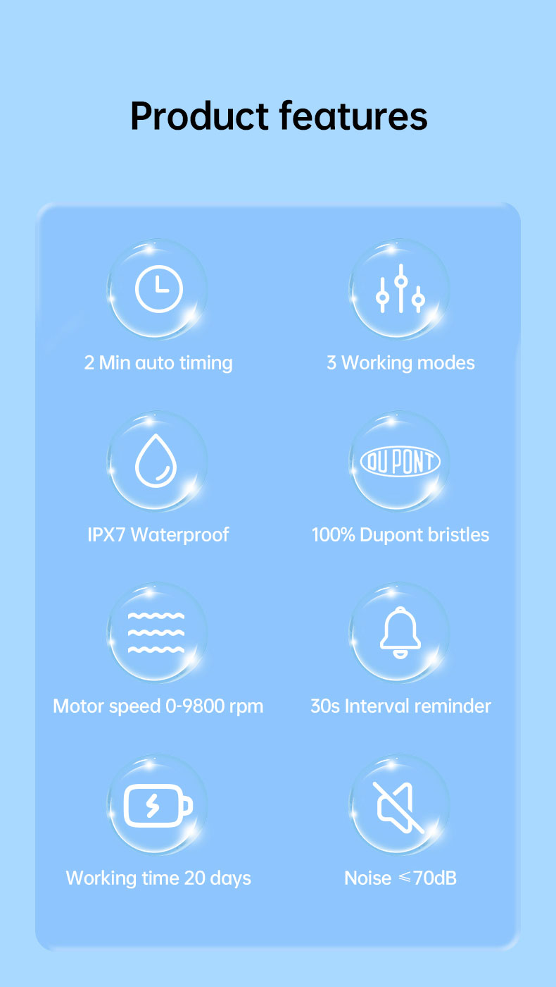 【3 режими для різноманітних потреб у догляді за ротовою порожниною】3 високопродуктивні режими розроблені, щоб задовольнити всі ваші потреби в догляді за ротовою порожниною та допомогти підтримувати здоров’я ротової порожнини. Відбілювання, очищення, чутлива, масаж. Режим відбілювання 100% видалення плям із зубів і зміщення зубного каменю на зубах. Режим Clean проникає глибоко в міжзубний проміжок, очищає бруд, прихований у пародонті. У той час як режим масажу пропонує ніжний масаж ясен