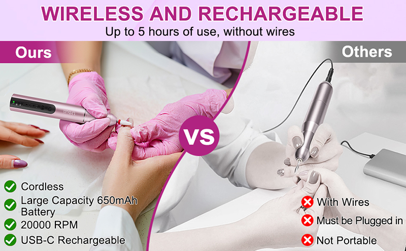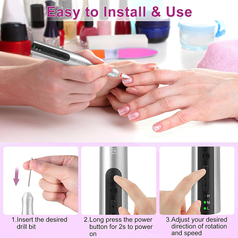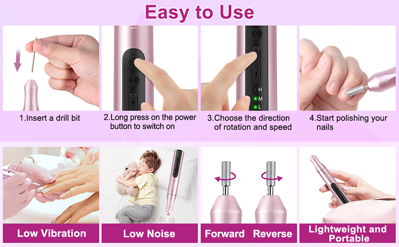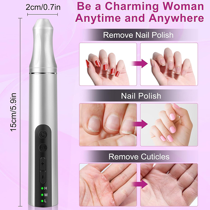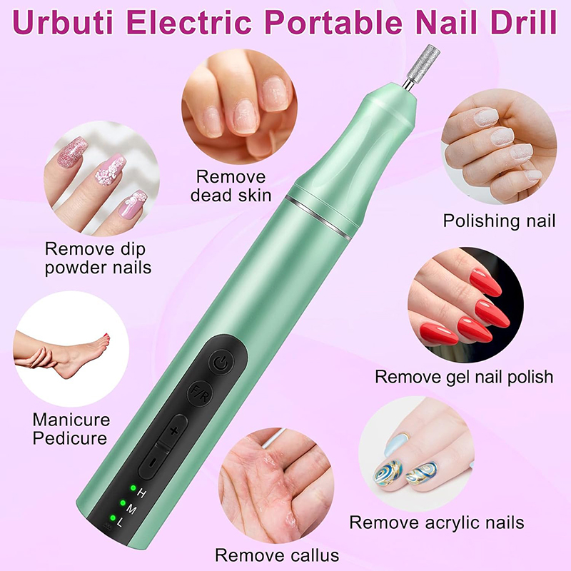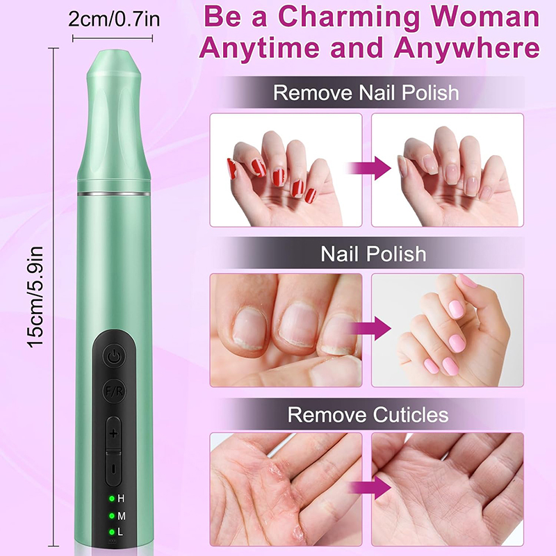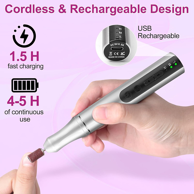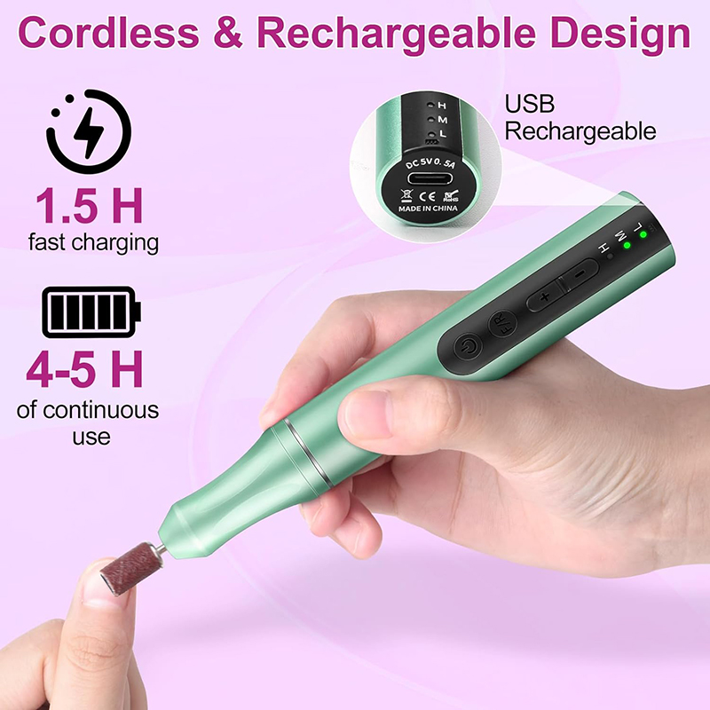 Свердла для акрилових нігтів розроблені так, що вони легкі (85 г) і можуть поміститися у вашу сумочку або кишеню одягу. Він також постачається з USB-кабелем для заряджання, який можна легко підключити до будь-якого USB-пристрою для заряджання, що робить його зручним для вас, щоб насолоджуватися доглядом за нігтями в будь-який час і в будь-якому місці.