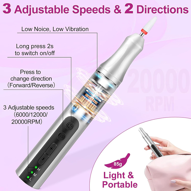 Професійна пилка для нігтів має 3 швидкості 6000-12000-20000, просто коротко натисніть кнопку + або -, щоб збільшити або зменшити швидкість. Легко регулювати швидкість і економити час при заточуванні нігтів. Напрямок свердла можна легко змінити, натиснувши кнопку F/R, що ідеально підходить для лівшів, майстрів манікюру або новачків у догляді за нігтями.