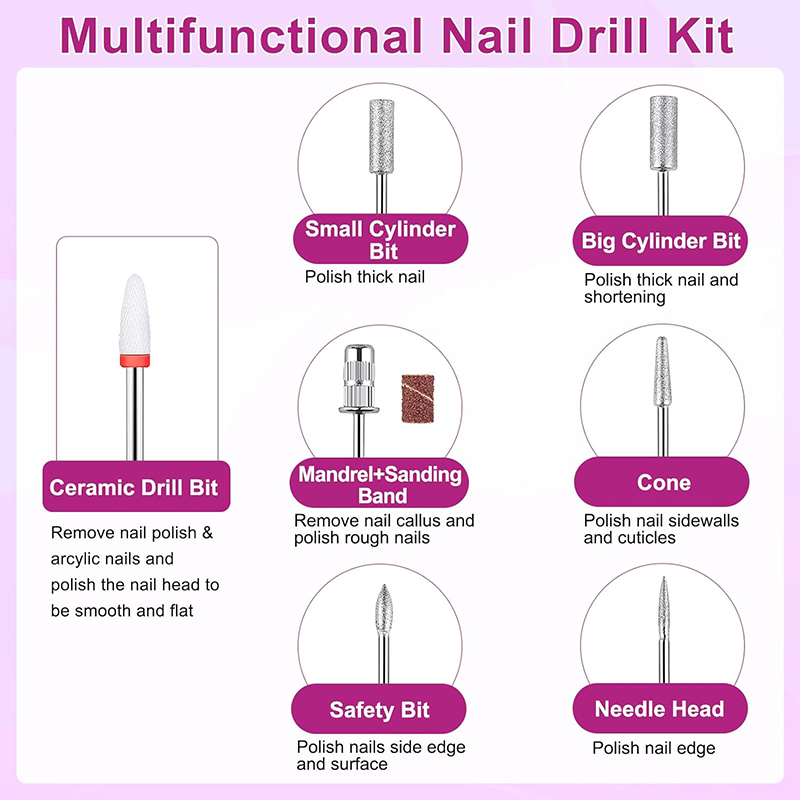 Машина для свердління цвяхів включає 6 свердл для цвяхів з нержавіючої сталі, 1 свердло для кераміки та 36 змінних шліфувальних смуг. Набір для манікюру-педикюру можна використовувати для манікюру, педикюру, полірування, надання форми, шліфування кутикули, видалення акрилових/гелевих нігтів або для краси нігтів. Укомплектований аксесуарами та простий у використанні, ідеально підходить для початківців нейл-арту!