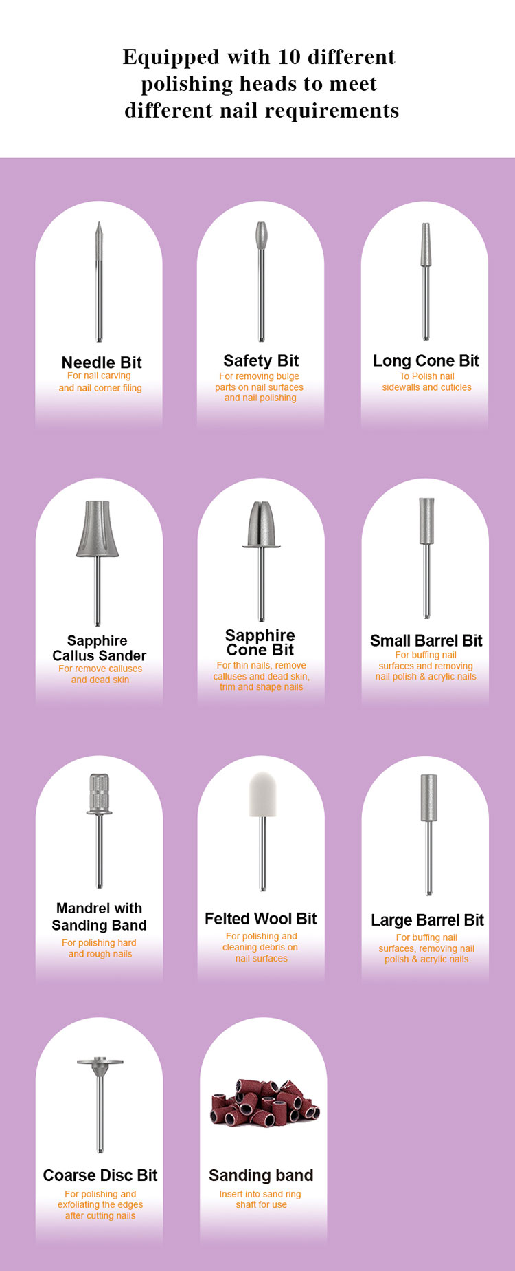 【Професійний догляд за нігтями для рук і ніг】 Завдяки 11 аксесуарам, включаючи різні шліфувальні головки та світлодіодні лампи та інструменти для кришки, цей набір для свердлінь відповідає всім вашим потребам у догляді за нігтями, від підпилювання та формування нігтів до видалення мозолів, і навіть підходить для гелевих нігтів. Насолоджуйтеся салонними процедурами вдома!