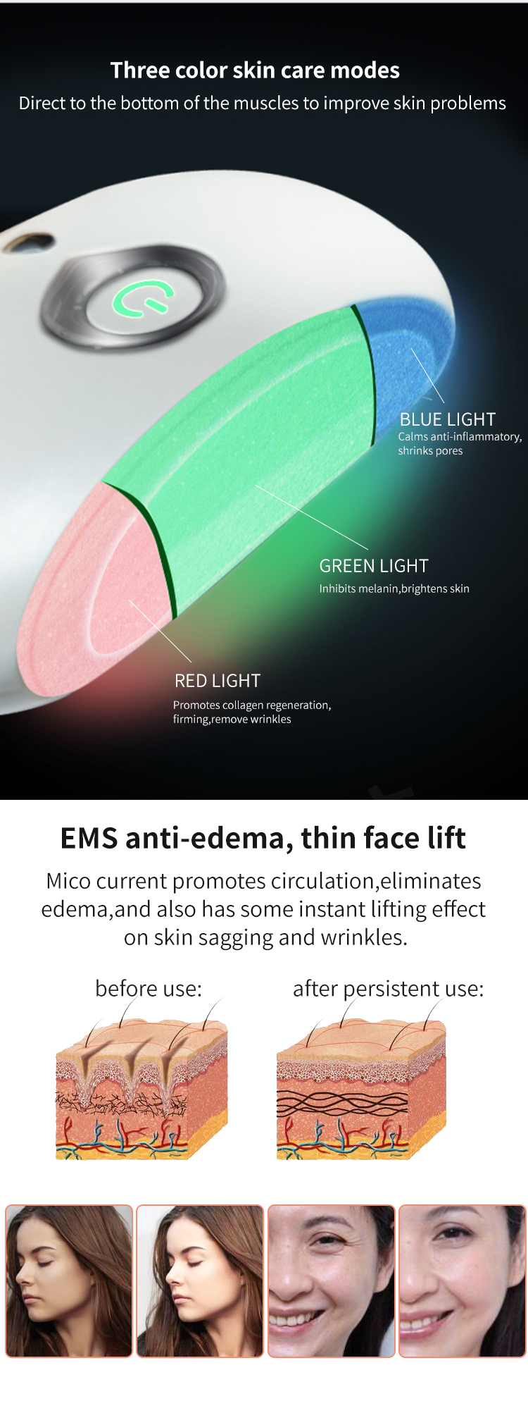 Три кольорові режими догляду за шкірою, безпосередньо до нижньої частини м’язів для вирішення проблем шкіри
