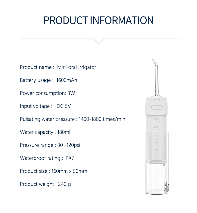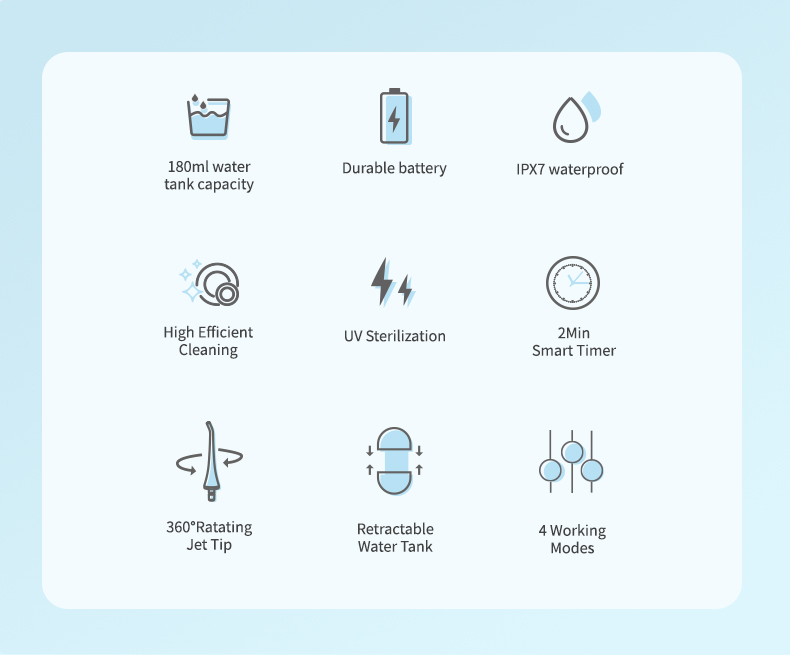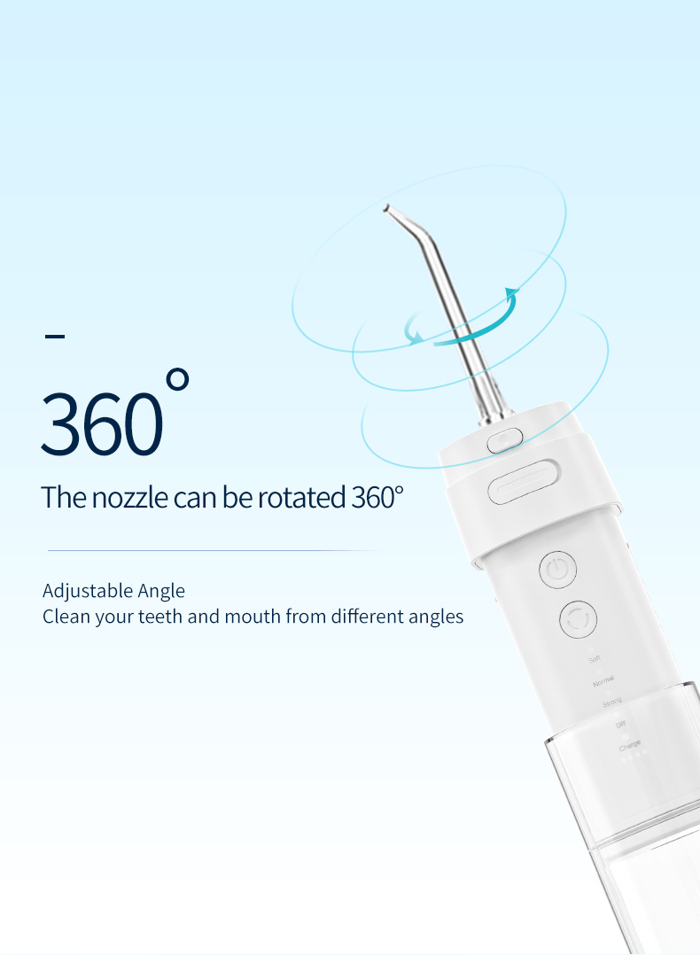 Цей зубний щипчик із водною ниткою подає імпульси високого тиску води зі швидкістю 1400-1800 разів на хвилину, ефективно видаляючи 99,9% зубного нальоту для глибокого очищення зубів. Цей зубний наконечник із водною ниткою масажує ясна, сприяє кровообігу та усуває проблеми ротової порожнини, як-от неприємний запах з рота, ортодонтичні зуби