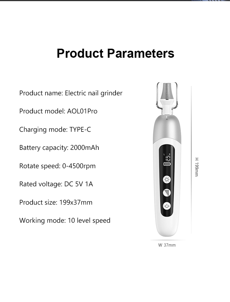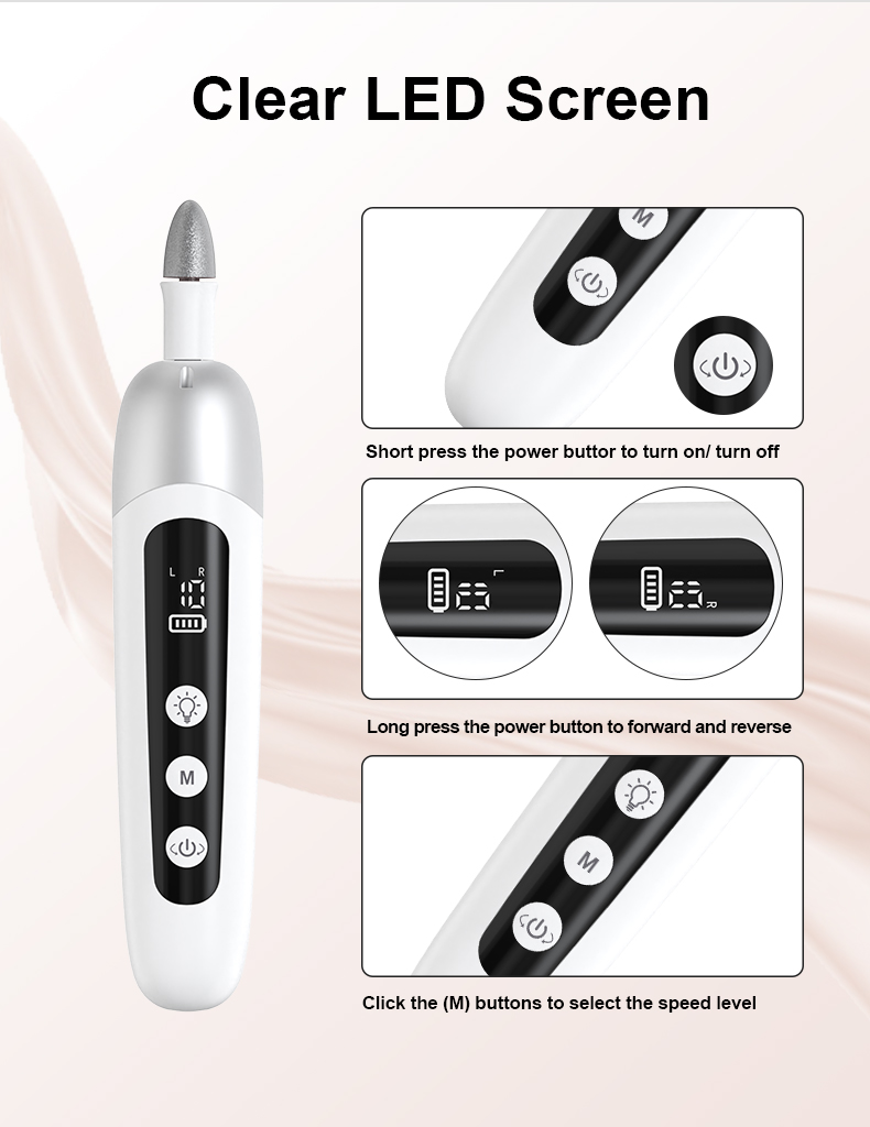 - ІННОВАЦІЙНИЙ СВІТЛОДІОДНИЙ ДИСПЛЕЙ: легка навігація по бажаним налаштуванням. Світлодіодний дисплей показує стан батареї, налаштування швидкості та обертання для легкої роботи. Електрична пилка для нігтів також оснащена вбудованим світлодіодним підсвічуванням, яке освітлює ділянки на руках і ногах