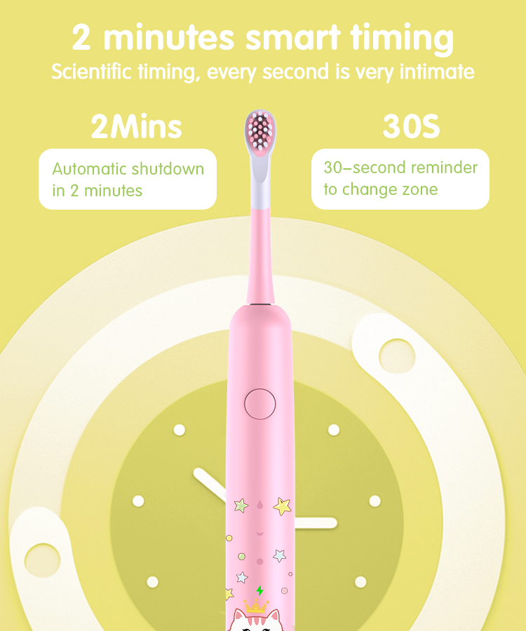 - АВТОМАТИЧНИЙ ТАЙМЕР: Ця електронна зубна щітка має вбудований 2-хвилинний інтелектуальний таймер, який заохочує вашу дитину чистити зуби довше, розвиває хороші звички чищення та зменшує карієс.