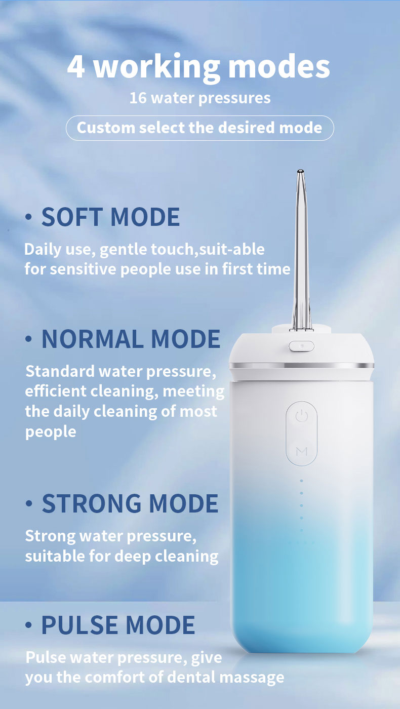 - Оновіть 4 режими за допомогою вибору «Зроби сам». Цей бездротовий водяний зубний зубочиститель було оновлено до режиму «Зроби сам», що дозволяє налаштувати власний режим чищення на основі стану ваших зубів, щоб захистити ясна, що більше підходить для людей з яснами. Він також має функцію пам’яті для наступного використання одним клацанням миші. Цей наконечник для зубної нитки з водою краще доглядає за вашою порожниною більш науковим способом, а також дуже простий у використанні