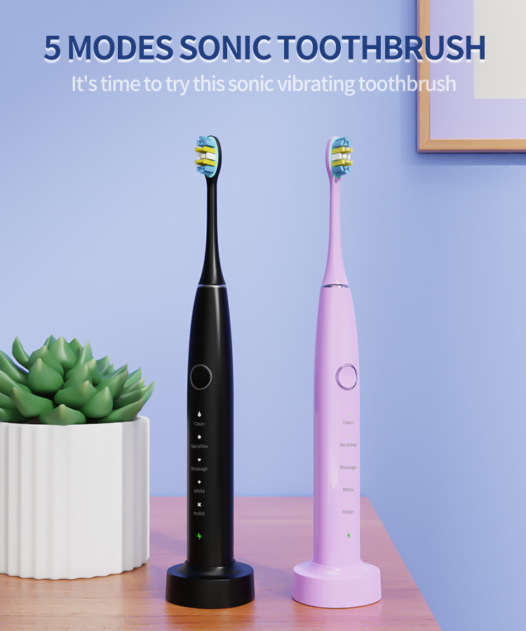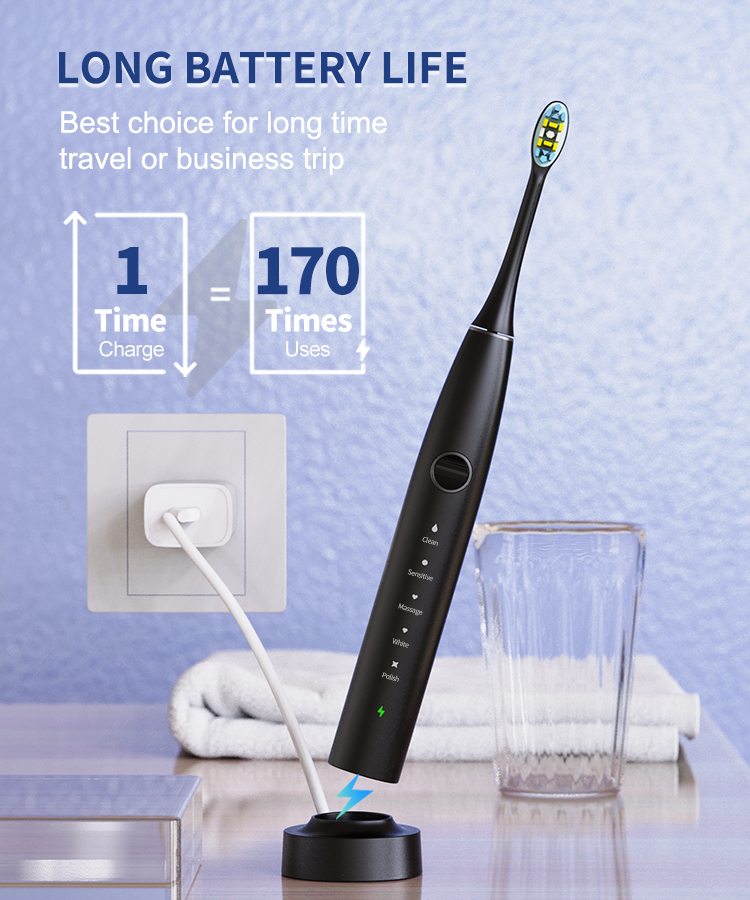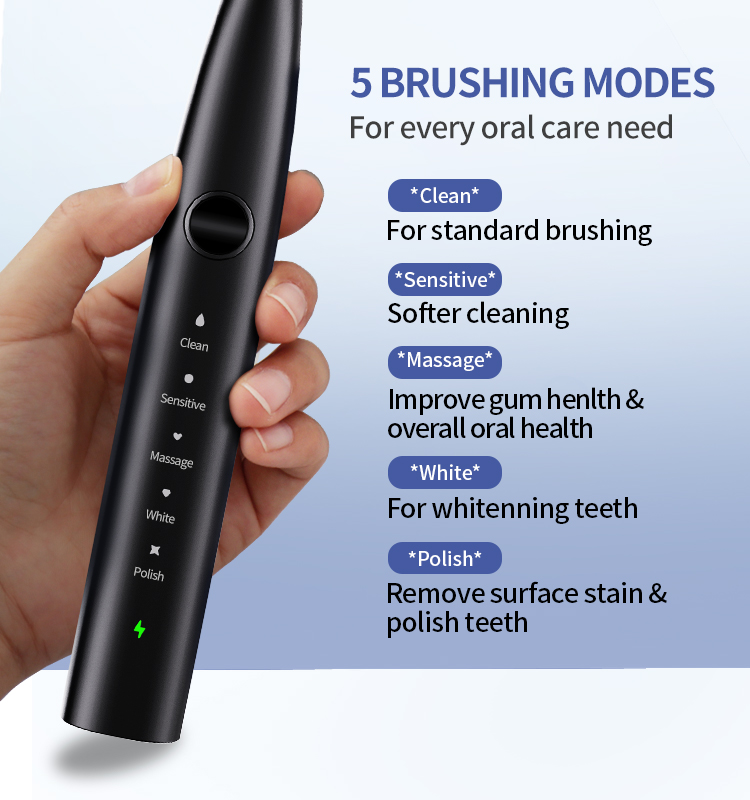 - 5 ВИСОКОЕФЕКТИВНИХ РЕЖИМІВ ЧИЩЕННЯ - Чистий (м’який), Білий (сильний), Полірований (сильна інвертована частота), М’який (м’який інвертований частота) і Чутливий (м’який), щоб відповідати різним умовам зубів і ясен, тому ви можете вибрати різні режими відповідно до ваших уподобань та рекомендацій стоматолога.