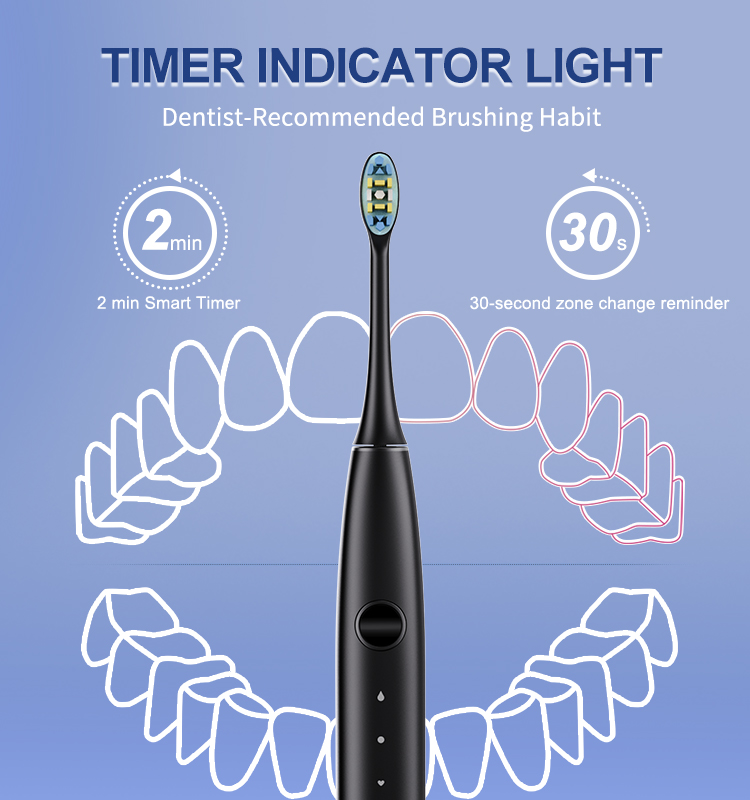 - ТАЙМЕР РОЗУМНОГО ВІБРАЦІЙНОГО ПОВІДОМЛЕННЯ - Вбудований інтелектуальний таймер з інтервалом у 30 секунд нагадує вам про перехід до наступного квадранта вашого рота, а загалом через 2 хвилини (4 квадранти), що настійно рекомендовано професійними стоматологами як правильний спосіб чищення зубів.